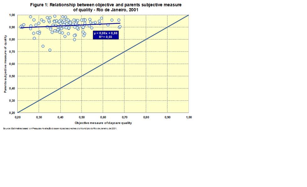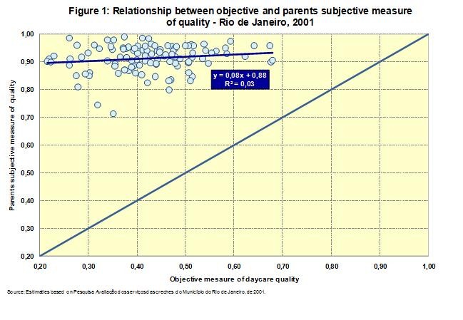 Here is evidence showing the same for Rio de Janeiro. The vertical axis shows parent evaluation, and the horizontal axis shows an objective measure. As you can see, parents think all the daycare centers are about the same.