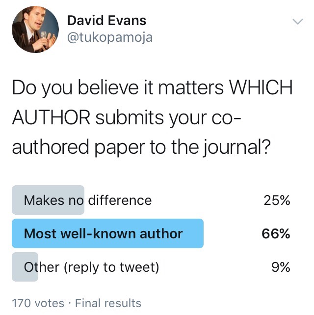 Here are the details: I posed the question, “Do you believe it matters WHICH AUTHOR submits your co-authored paper to the journal?”