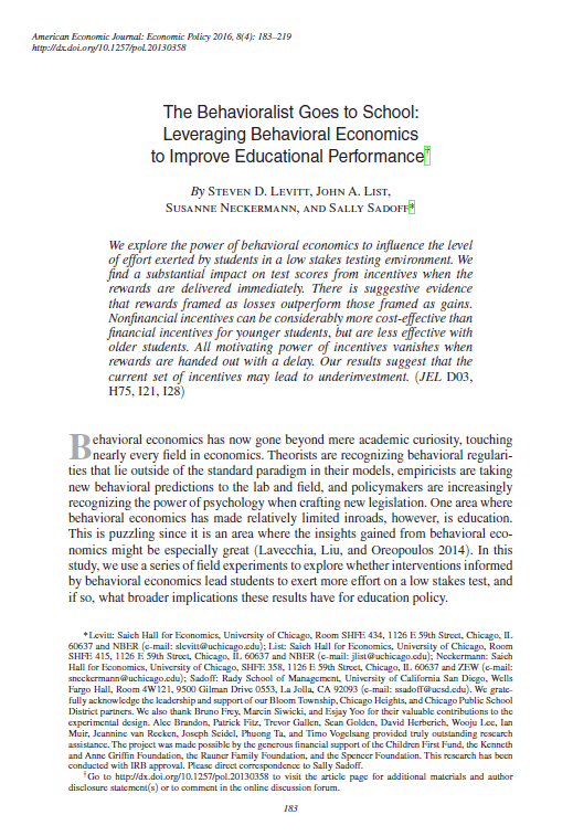 Alternative title – Quick take: “The Behavioralist Goes to School,” by Levitt et al.